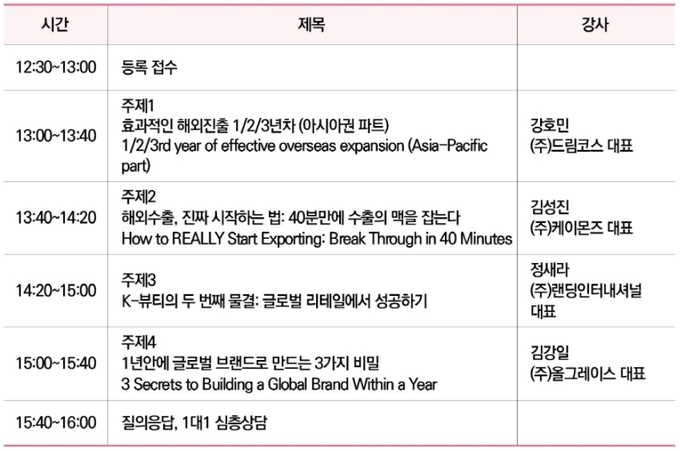 주제발표는 ▲효과적인 해외진출 1/2/3년차(아시아권 파트) ▲해외수출, 진짜 시작하는 법: 40분 만에 수출의 맥을 잡는다 ▲K-뷰티의 두 번째 물결: 글로벌 리테일에서 성공하기 ▲1년 안에 글로벌 브랜드로 만드는 3가지 비밀 등으로 진행된다.