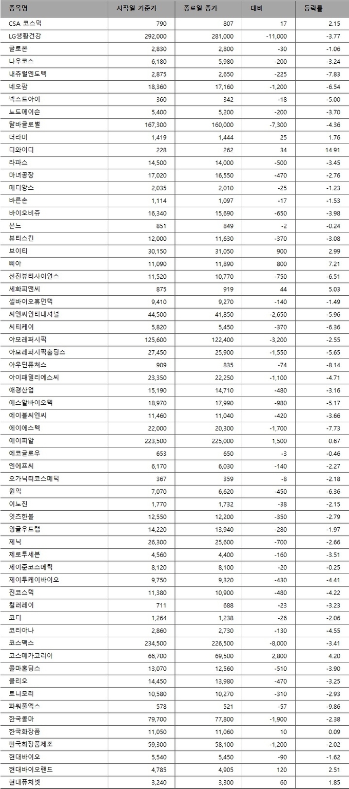 파워풀엑스(-9.86%), 아우딘퓨쳐스(-8.14%), 내츄럴엔도텍(-7.83%), 에이에스텍(-7.73%), 네오팜(-6.54%), 선진뷰티사이언스(-6.51%), 씨티케이(-6.36%), 원익(-6.36%), 씨앤씨인터내셔널(-5.96%), 아모레퍼시픽홀딩스(-5.65%), 에스알바이오텍(-5.17%), 넥스트아이(-5.00%)의 주가는 하락했다.