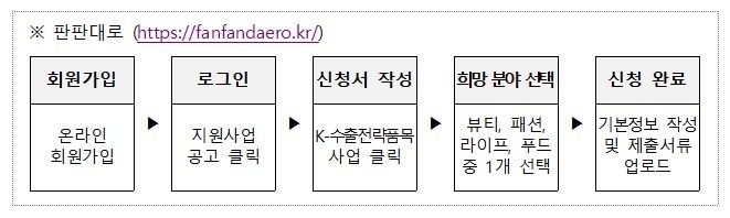 지원규모는 ‘25년 80개 내외로 선정하며, 신청자격은 ’24년 수출실적(금액 제한 없음)이 있는 중소기업이면 된다. 분야는 뷰티, 패셔니 라이프, 푸드가 해당된다. (2개 분야 신청 가능, 중복 선정 시 1개 분야만 선택)