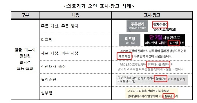 의료기기로 허가받지 않은 제품은 ‘의료기기법’(법률 제20888호)에 따라 의료기기의 성능, 효능 및 효과에 관한 표시·광고를 할 수 없으나 7개 제품이 주름 개선, 리프팅, 세포 재생 등 의료기기로 오인할 수 있는 효과를 표시·광고하고 있었다.