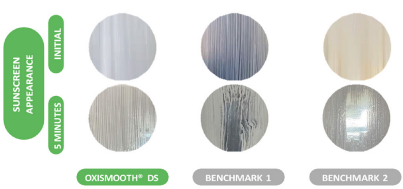 피부 기질(VITROSKIN®)에서의 평가에서도 필름 성능은 분명했다. OXISMOOTH® DS는 접촉각을 86.7°까지 높이며 표면 소수성을 강화했고 물 접촉 후에도 균일하고 응집력 있는 필름을 유지했다. 이는 자외선 차단 지속성과 사용자 체감 성능에 직접적으로 연결되는 요소다.