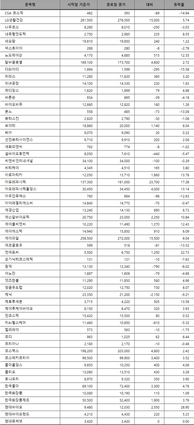 지난 한 주 현대바이오(26.90%), 엔에프씨(22.73%), 아모레퍼시픽(17.26%), 아로마티카(13.78%), 제로투세븐(13.59%), 아모레퍼시픽홀딩스(13.14%), 에이블씨엔씨(12.43%), 노드메이슨(12.35%), 에스알바이오텍(10.84%) 등의 주가 상승폭이 두드러졌다.