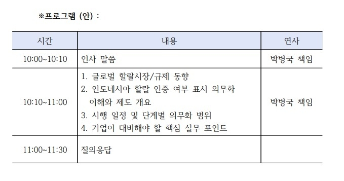 웨비나 주요 내용은 ▲ 글로벌 할랄시장/규제 동향 ▲ 인도네시아 할랄 인증 여부 표시 의무화 이해와 제도 개요 ▲ 시행 일정 및 단계별 의무화 범위 ▲ 기업이 대비해야 할 핵심 실무 포인트 ▲ 질의 응답 등이다.