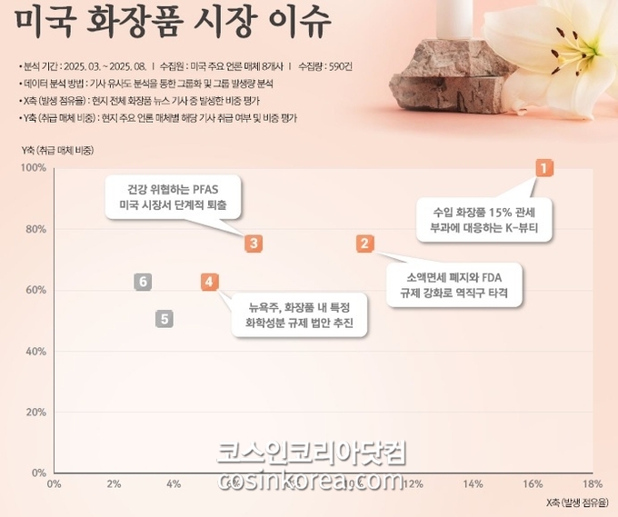 연구원은 “미국의 관세 정책과 소액 면세 제도 폐지는 단기적으로 K-뷰티 업계에 타격을 주겠으나, 한국 화장품 브랜드 특유의 현지화 전략과 높은 소비자 충성도 등 장기적인 성장 여력이 있다는 평가가 있다”며, “유통 채널 다각화와 현지 법인 설립 등 정책 변화에 유연하게 대응할 수 있는 중장기 전략 마련이 필요하다”고 조언했다.