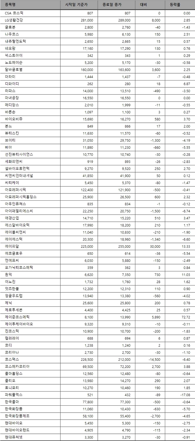 한국거래소에 따르면, 9월 29일부터 10월 2일까지 한 주간 화장품 기업의 주가는 전주 대비 0.81% 상승했다. 해당 화장품 기업은 네이버증권 화장품업종에 속한 기업 67곳 가운데 우선주와 거래정지 중인 에스디생명공학, 코스나인을 제외한 61곳을 기준으로 했다.