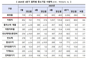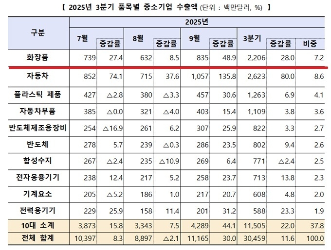 [코스인코리아닷컴 김민석 기자] K-뷰티 중소기업의 글로벌 시장개척 저력이 또 한번 새로운 역사를 썼다. 27일 중소벤처기업부의 ‘25년 3분기 중소기업 수출 동향에 따르면 1위 품목 화장품은 역대 최고 실적을 올린 것으로 나타났다.