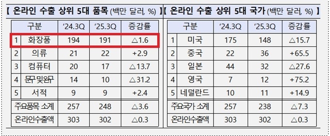 화장품 최대 수출국 미국은 역대 분기 중 최고 실적을 기록했으며, 대 폴란드 등 유럽, UAE 수출 호조세가 지속됐다. 중국+홍콩의 중화권이 증가세로 돌아서며 중소기업들이 끊임없이 중국 시장을 두드리고 있음이 확인됐다. 미국 관세 영향에 따라 중국 기업들이 한국을 통한 우회전략의 수요가 반영된 게 아니냐는 관측이 나왔다.