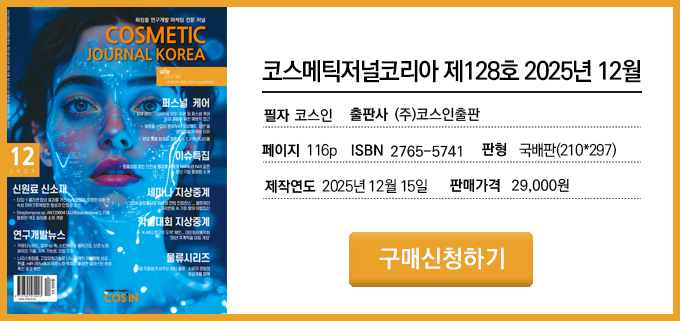코스메틱저널코리아(CJK)는 화장품 연구개발 기술 분야에서 화장품 연구자들의 연구 논문과 상품기획, 품질관리, 최신 트렌드, 물류, 해외시장 정보 등을 공유하는 연구개발(R&D)과 마케팅 분야 전문 매체다. 2025년 12월호 주요 내용은 아래와 같다.