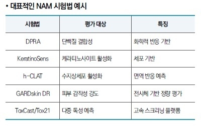 이에 따라 ➊ DPRA(Direct Peptide Reactivity Assay): 공유 결합 능력 평가 → OECD TG 442C ➋ KeratinoSens™: 각질형성세포의 활성화 측정 → OECD TG 442D ➌ h-CLAT (Human Cell Line Activation Test): 수지상세포 활성화 평가 → OECD TG 442E 등 ‘in chemico' 시험법이 개발됐다.