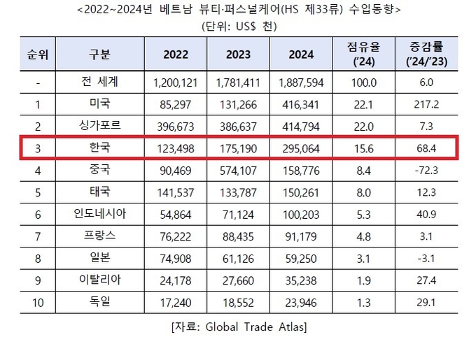 ’24년 뷰티·퍼스널케어(HS 제33류) 총수입액은 약 18.9억달러로 전년 대비 6.0% 성장하며 소득 증대에 따른 외모 관리 지출 확대 추세를 반영하고 있다.