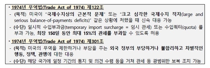 무역법 301조는 “미국의 무역을 제한하거나 부담을 주는 외국정부의 부당하거나 불합리하고 차별적인 행동, 정책, 관행에 대한 대응을 목적으로 하며, 해당 국가에 일정 기간의 통지 및 의견 수렴 등을 거쳐 관세 등 광범위한 보복 조치가 가능하다”고 규정하고 있다.