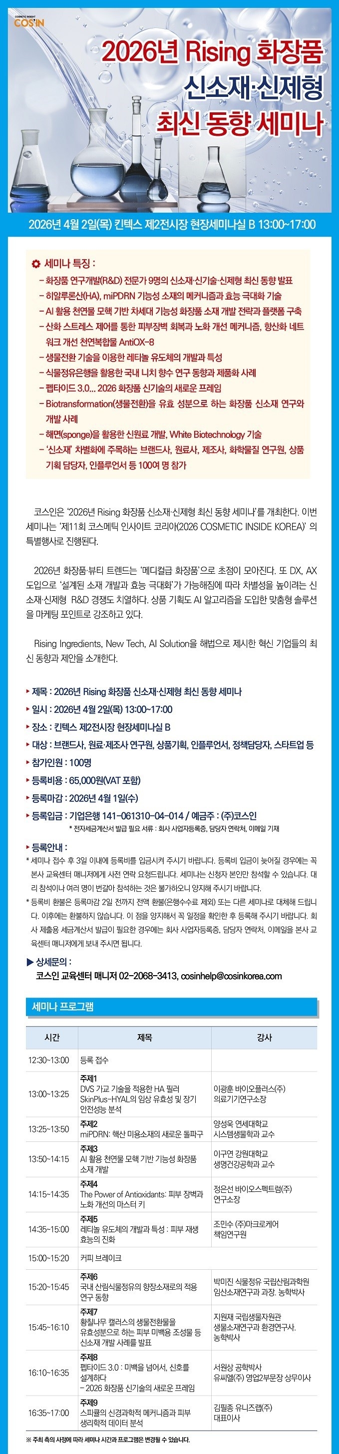 이와 관련 코스인(COS’IN)은 ‘2026년 Rising 화장품 신소재·신제형 최신 동향 세미나’를 4월 2일(목, 13:00~17:00) 킨텍스 제2전시장에서 개최한다. 현재 각광받고 있는 신소재·신기술을 공개하고, 미래 R&D 동향을 공유하는 자리다.