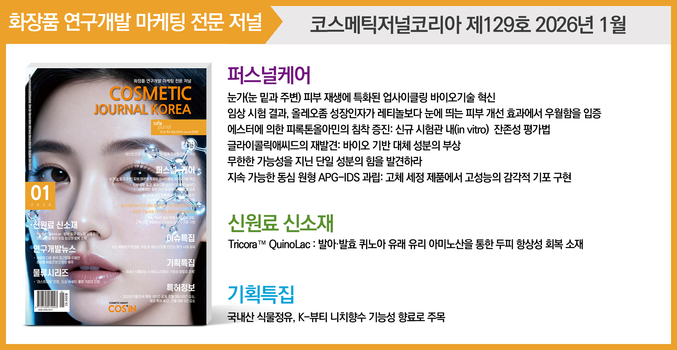 [코스인코리아닷컴 길태윤 기자] 국내 대표 화장품 연구개발(R&D)·마케팅 전문 저널 코스메틱저널코리아(CJK)가 2025년 11월호를 발간했다. 이번 호는 퍼스널케어 분야의 제형·효능 연구부터 지속가능한 신원료·신소재, 특허 정보, 연구개발뉴스까지 화장품 산업 전반의 최신 연구 흐름을 폭넓게 담았다. 11월호 특집 기사로는 ▲바이오 계면활성제를 이용한 제형 개발 – 양성자와 물 경도 사이의 경쟁 현상에 대한 물리화학 ▲BiomMucin™ Series: 동물성 뮤신 대체를 위한 지속가능한 3세대 미생물 Mucin ▲한국의 화장품 안전성 평가제도 도입에 글로벌 규제 전문가 관심 집중 등이 실렸다. 이와 함께 OEM·ODM 기업 (주)나투젠, (주)니코메디칼과 원료 선도 기업 (주)라비오, (주)리제론의 정보도 함께 수록됐다. 가장 주목되는 콘텐츠 중 하나는 신원료·신소재 코너에 실린 (주)모아캠 연구소의 ‘BiomMucin™ Series’ 연구다. 해당 연구는 미생물 발효 기반 기술을 활용해 동물성 뮤신을 대체할 수 있는 소재를 개발한 성과를 다뤘다. 연구진은 미생물이 생성하는 세포 외 고분자 물질(EPS)에 주목해 BiomMucin™ Barr