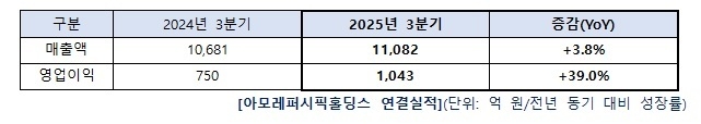 [코스인코리아닷컴 길태윤 기자] 아모레퍼시픽 그룹이 연결 기준으로 매출 1조 1,082억 원, 영업이익 1,043억 원의 2025년 3분기 실적을 발표했다. 라네즈, 에스트라, 설화수, 려 등 주요 브랜드의 글로벌 확산과 운영 효율화에 힘입어 주력 계열사인 아모레퍼시픽이 그룹 전체 매출 성장과 수익성 개선을 이끌었다.