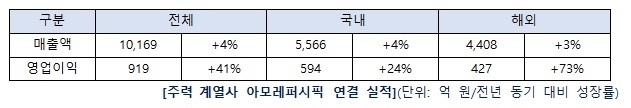 주력 계열사 아모레퍼시픽의 매출은 전년동기 4%, 영업이익은 41% 증가했다. 국내 사업은 온라인, MBS(멀티브랜드숍), 백화점 등 주요 내수 채널은 물론, 면세와 크로스보더(국내 본사에서 해외 유통사, 리테일러와 직접 협업해 현지 진출하는 사업모델) 채널 판매가 크게 확대되며, 매출은 전년동기 대비 4%, 영업이익은 24% 증가했다.