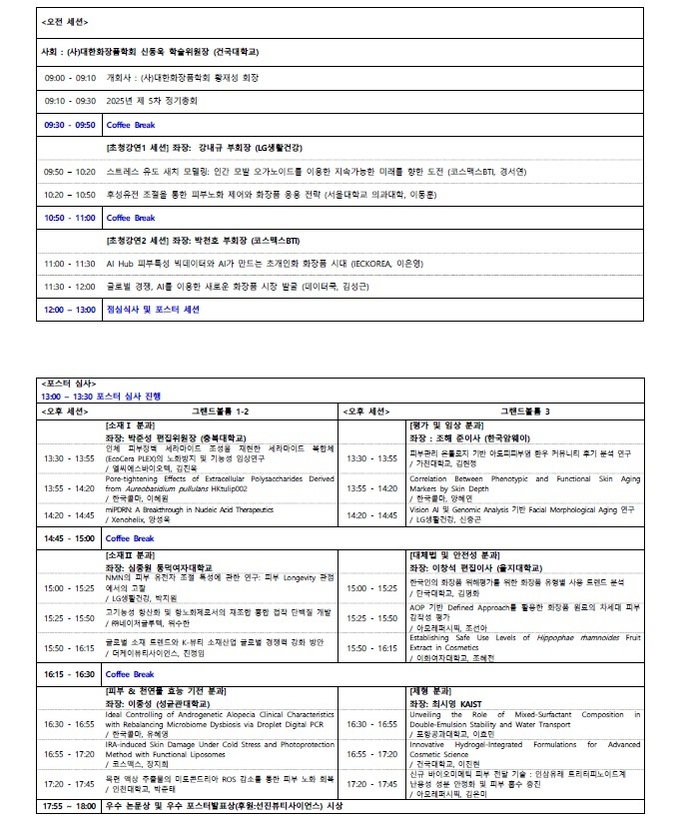 오후 세션은 소재, 제형, 평가 및 임상, 피부 & 천연물 효능 기전, 안전성, 대체법 등 6개 분과 강연 총 18편의 논문이 발표된다.