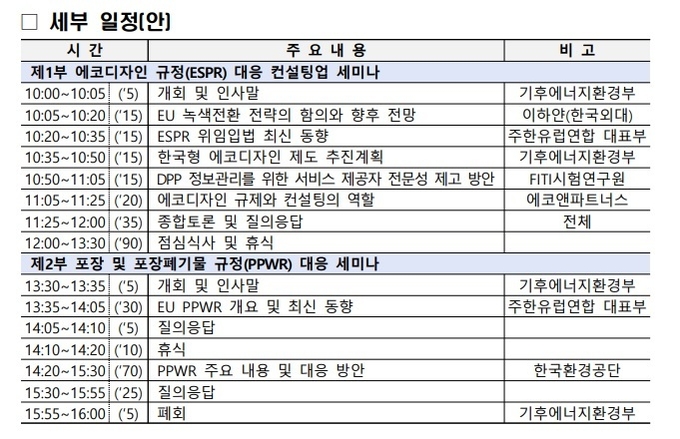 기후에너지환경부는 EU 최신동향을 공유하고, 이에 대응하기 위한 정부 및 산업계 대응전략을 모색한다. 참가 대상은 제품·포장재 생산자, 컨설팅업체, 법무·회계법인 등이다.