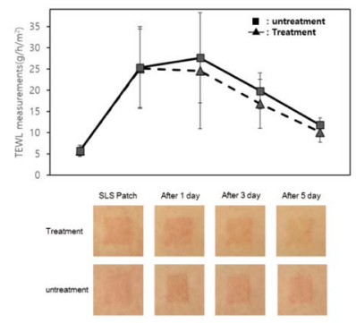 그림 SLS로 손상된 피부에서 BioGenic Ceranova 적용군과 무처리군의 TEWL 변화 비교