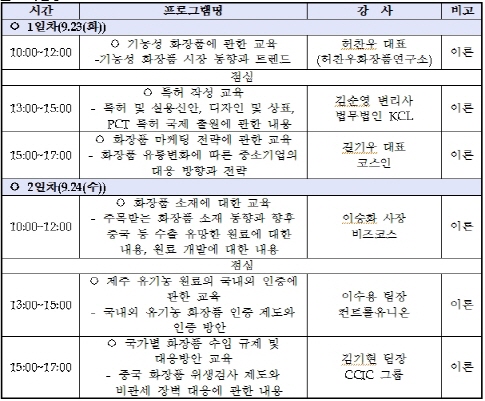 제주와 충북 화장품 기업 종사자를 대상으로 진행하는 이번 교육은 국내 화장품관련 전문 강사를 초청, 화장품 관련기업의 역량을 향상시키기 위한 자리이다.
