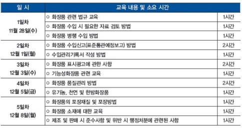 주요 교육 프로그램으로는 화장품 관련 법규 교육, 화장품 수입 시 필요한 자료 검토 방법, 화장품 병행 수입 방법, 화장품 수입신고(표준통관예정보고) 방법, 수입관리기록서 작성 방법, 화장품 표시광고에 관한 사항, 기능성화장품 관련 교육, 화장품 품질관리 방법, 유기농, 천연 및 한방화장품, 화장품의 포장재질 및 포장방법, 화장품 소재에 대한 교육, 제조 및 판매 시 준수사항 및 위반 시 행정처분에 관련된 사항 등으로 구성됐다.