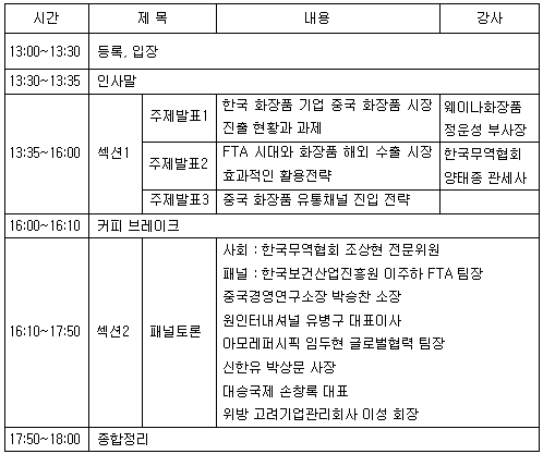 2개 세션으로 나눠 진행되는 이날 포럼은 한-중 FTA 협정에 따른 국내 화장품 기업 중국 화장품 시장 진출 현황과 FTA 활용 전략, 중국 화장품 유통채널 진입 전략에 대해 3명의 주제발표에 이은 7명의 전문가 패널 토론 방식으로 진행된다.