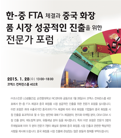 코스인(대표 길기우)은 ‘한-중 FTA 체결과 중국 화장품 시장 성공적인 진출을 위한 전문가 포럼을 1월 28일 서울 삼성동 코엑스 컨퍼런스룸 402호에서 개최한다.