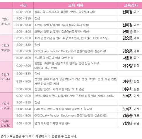 그 밖에 소비자 니즈 파악과 창의적인 컨셉잡는 노하우와 아이디어 도출방법, 신제품 개발시 상품 선택의 기준 정하는 방법, 용기패키징 디자인 방법, 제조원가 판매원가, 타깃 포스팅 방법 등을 실시한다.