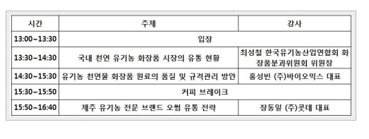 첫 강은 한국유기농산업연합회 화장품분과위원회 최성철 위원장이 ‘국내 천연 유기농 화장품 시장의 유통 현황’에 대해 강의할 예정이다.