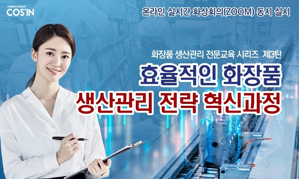 코스인은 화장품 생산관리 전문교육 시리즈로 ‘효율적인 화장품 생산관리 전략 혁신과정’ 교육을 실시한다. 이번 교육은 2021년 3월 18일 서울 가산동에 위치한 스타밸리 513호 코스메틱 아카데미에서 진행되며, 온라인 실시간 화상회의(ZOOM)를 동시에 실시한다.