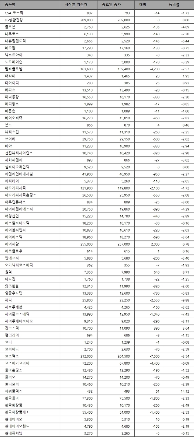 제닉(-9.88%)은 주가가 10% 가까이 빠졌고 제이준코스메틱(-7.43%), 코스메카코리아(-6.09%), 잉글우드랩(-5.83%), 내츄럴엔도텍(-5.44%), 글로본(-4.89%), 아이패밀리에스씨(-4.29%) 등은 5% 안팎의 주가 하락을 기록했다.
