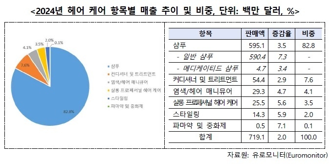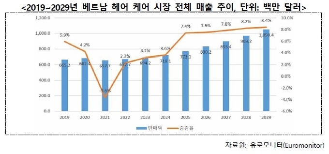 베트남의 헤어케어 시장은 △ 샴푸 6억달러(점유율 83%) △ 컨디셔너 및 트리트먼트(7.6%) △ 염색·헤어 매니큐어(4.1%) 등이다. 소비자들의 기초 위생 관리 수요와 더불어 스타일링 및 외모 관리에 대한 관심이 점차 확대되고 있다. 이외 △ 살롱 프로페셔널 헤어케어(3.5%) △ 스타일링 제품(2%)은 규모는 작지만 성장률은 각각 5.6%, 5.9%로 프리미엄 및 틈새시장에서의 확장 가능성이 높다는 평가다.
