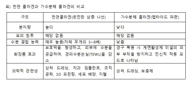 반면에 가수분해된 콜라겐은 온전한 삼중 나선 구조가 없다. 다음 표는 천연 콜라겐과 가수분해 콜라겐의 차이점을 보여준다.