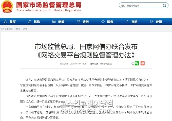 [코스인코리아닷컴 김민석 기자] 중국 시장감독총국 및 인터넷정보판공실은 ‘온라인 거래 플랫폼 규칙 감독관리방법(网络交易平台规则监督管理办法)’을 공동 발표했다. 이에 따르면 온라인 거래 플랫폼의 규칙 제정·개정·집행을 규범화해 거래 질서를 유지하고, 사업자와 소비자의 합법적 권익 보호를 강화하는 것을 목적으로 하고 있다.