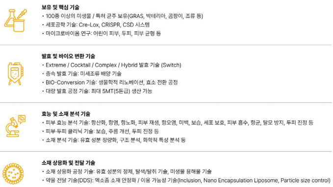(주)라비오는 극한 미생물/특허 균주 100종 이상을 보유 (GRAS, 세균, 균류, 조류)하고 있다. 이를 기반으로 △ 세포 공학 (Cell Engineering) : Cre-Lox, CRISPR, CSD System △ 마이 크로바이옴(Microbiome) : 아이 피부, 두피, 질 등 △ 효능 분석 기술: 항산화, 항염, 항노화, 피부재생, 항오염, 미백, 보습, 세포 독성, 세포 보호능, 피부 흡수력, 항균, 탈모 예방, 두피 진정 등 △ 피부/두피 임상 : 피부 보습, 주름개선, 진정, 두피 진정 등 △ 소재 분석 기술 : 유용물질 정량화 및 구조분석 기술, 이화학적 특성 분석 등 △ 종속 발효(미세조류 배양 기술) 등을 보유하고 있다. 이외 34종의 특허도 획득했다.