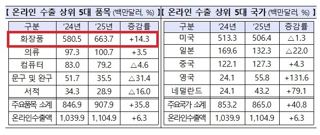 한편 온라인 수출은 화장품이 6.6억달러로 전년 대비 14.3% 증가했다. 영국(+261.7%), 네덜란드(+138.0%) 등 유럽 수출이 급증하며 실적을 견인했다.