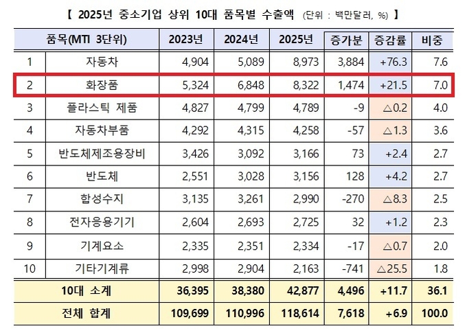 우리나라 중소기업 수출액은 1186억달러로 사상 최대를 기록했다. 전년 보다 6.9% 증가했으며, 수출 중소기업 수는 9만 8천 219개사로 2.5% 증가했다. 중소기업 수출품목 1위는 중고차 수출이 18개월 연속 증가한 자동차가 차지했으며, 화장품은 2위에 랭크됐다.