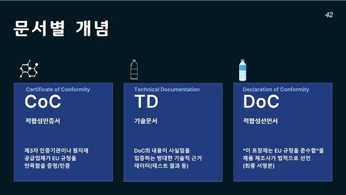참고로 ① 원료공급사=CoC(Certificate of Confirmity, 적합성인증서) 제3자 인증기관이나 원자재 공급업체가 EU 규정을 만족함을 증명/인정 ② 포장재 제조사=TD(Technical Documentation, 기술문서) DoC의 내용이 사실임을 입증하는 방대한 기술적 근거 데이터(테스트 결과 등) ③ 제품 제조사=DoC(Declaration of Conformity, 적합성선언서) ’이 포장재는 EU 규정을 준수함’을 제품 제조사가 법적으로 선언(최종 서명본) 등을 각각 작성해야 한다.