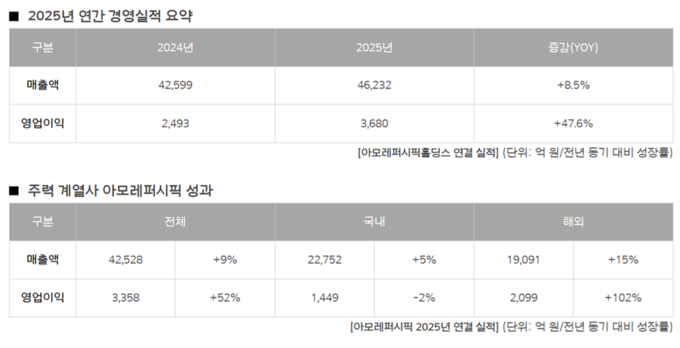 주력 계열사인 아모레퍼시픽의 매출이 전년 대비 9.5%, 영업이익은 52.3% 증가하며 그룹 전체 실적 개선을 견인했다.