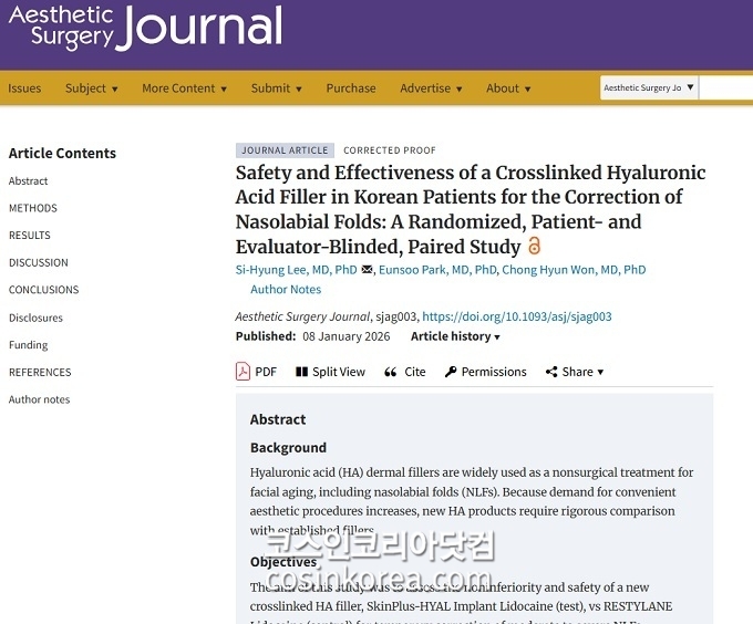 연구 결과는 SCI급 국제 학술지인 Aesthetic Surgery Journal에 게재됐으며, PubMed를 통해서도 확인할 수 있다. SCI급 학술지는 엄격한 동료 평가를 거쳐 게재되는 권위 있는 학술지로, 이번 게재는 스킨플러스 하이알의 안전성과 효능이 세계적으로 인정받았음을 의미한다.