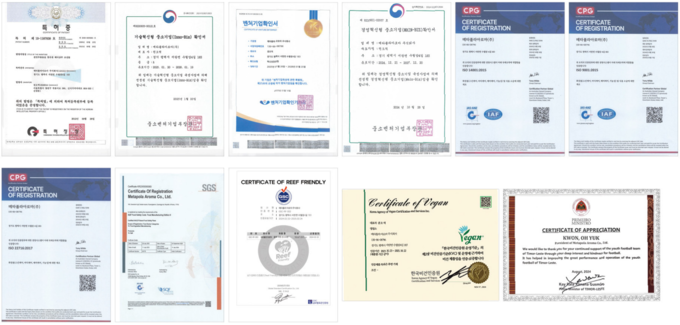 현재 벤처기업 인증과 기술 혁신형 중소기업 인증을 획득했으며 ISO 9001(품질경영), ISO 14001(환경경영), ISO 22716(국제화장품 GMP) 인증과 비건 인증 등 다수 국제 인증을 받았다. 또한 최신 스마트 제조 설비를 활용해 균일한 품질의 제품을 생산하고 있다. 진공아지호모믹서(6000kg, 1000kg, 500kg), 핀밀과 스피드 믹서, 디스퍼 믹서, 리본 믹서(100kg, 200kg, 300kg) 등을 보유하고 있다. Rotery Tablet Machine, Big size Tablet Machine, Bath Balm Machine, 자동 마스크팩 충전기, 형상파 우치 포장기(파우더 1대, 크림 3대) 등 최신 자동화 설비를 통해 고품질 제품을 생산라인을 확충하고 있다.
