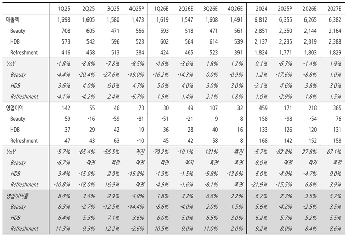 LG생활건강 2025년 실적 추이 및 전망 (단위: 십억 원)