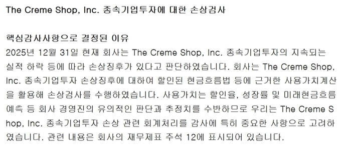 특히 북미 시장 진출의 핵심 축이었던 더크렘샵은 감사인의 핵심감사사항(Key Audit Matters)으로 지정됐다. 감사인인 삼일회계법인은 더크렘샵의 지속적인 실적 하락을 손상 징후로 판단하고 회수가능액 평가와 손상검사 과정의 적정성을 중점적으로 검토했다. 회사는 할인된 현금흐름법을 적용해 사용가치를 재평가하는 등 보수적인 회계 처리를 진행했다.