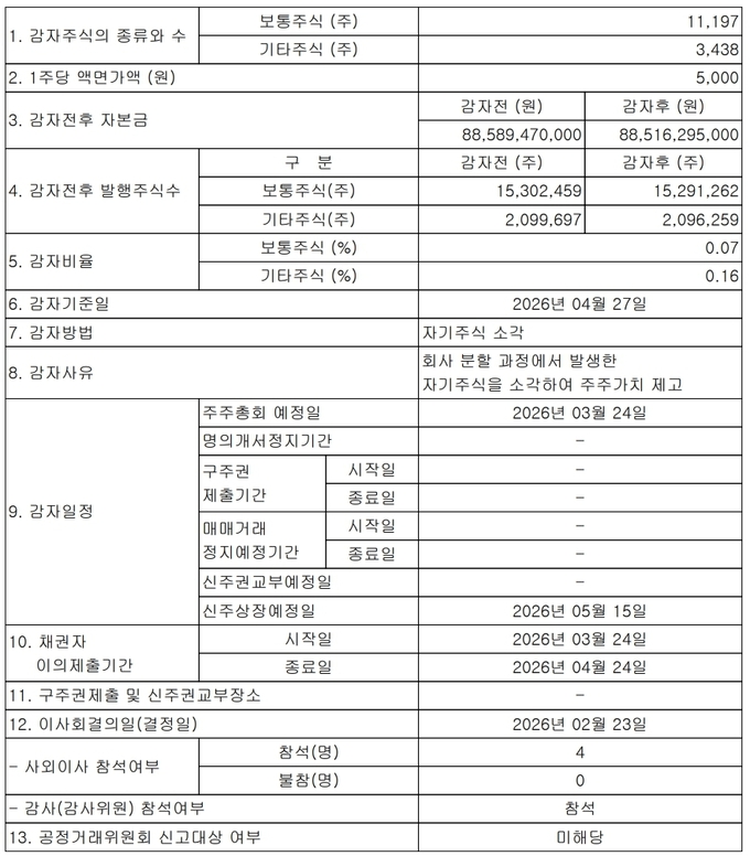 이번 소각 대상은 2001년 4월 회사 분할 당시 발생한 단주를 취득해 보유해 온 자사주다. 보통주 1만1,197주와 기타주 3,438주가 포함되며, 일반 주주의 보유 지분에는 변동이 없다. 1주당 액면가액은 5,000원이다. 감자 전 자본금은 885억8,947만 원에서 감자 후 885억1,629만5,000원으로 약 7,318만 원 감소한다. 발행주식 수는 보통주 기준 1,530만2,459주에서 1,529만1,262주로 줄어들고, 기타주식은 209만9,697주에서 209만6,259주로 감소한다. 감자 비율은 보통주 0.07%, 기타주 0.16% 수준이다.