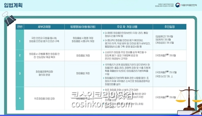 주요 제도 개선을 위한 입법 일정을 살펴보면, 지난해 화장품 안전성 평가 도입을 위한 법 개정안이 국회를 통과함에 따라 올해 6월까지 입법예고를 비롯한 후속조치를 마무리할 예정이다. e-라벨 제도 도입을 위한 화장품법 개정은 연내 완료를 목표로 한다. 이와 함께 범정부 협의회를 중심으로 화장품 산업지원 기본계획을 5년 주기로 수립하는 내용을 골자로 하는 화장품법 개정도 추진 중이다. 해당 법안은 지난해 12월 발의돼 현재 국회에서 논의가 진행되고 있다.