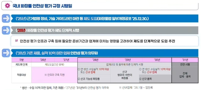 평가 대상은 단계적으로 적용·확대된다. 2026~2027년 2년간의 유예기간을 거쳐 제도가 본격 시행되는 2028년에는 연 생산액 10억 원 이상 기업의 신규 기능성 화장품부터 평가가 의무화되며, 2030년에는 연 생산액 10억 원 이상 기업 또는 신규 업체의 전체 제품으로 범위가 확대된다. 다만, 수입대행형 제품 등 일부 품목은 적용 대상에서 제외된다.
