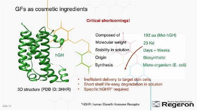 이제 어떻게 하면 성장인자를 화장품 성분으로 가장 효과적으로 활용할 수 있을지 고민해 보자. 대표적인 예로 한 가지 성장인자를 선택해 보자. 여기서는 hGH (human growth hormone, 인간 성장 호르몬)을 예로 든다.