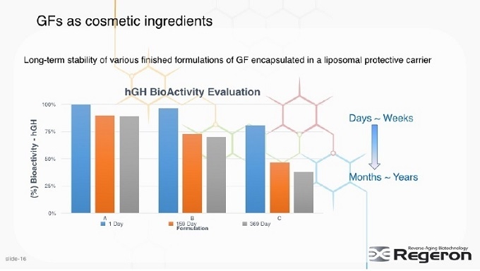 이러한 측면(용액 내 hGH의 장기 안정성 및 생물학적 활성)과 관련해, hGH를 리포좀 제형으로 캡슐화함으로써 이 두 가지 조건을 모두 충족할 수 있음을 제시한 바 있으며, 관련 실험적 증거를 제시하며 자세히 설명했다. (오달균, 기능성 화장품 원료로서의 단백질 검증 - hGH 사례. SOFW 135, 5-2009, 2-11)
